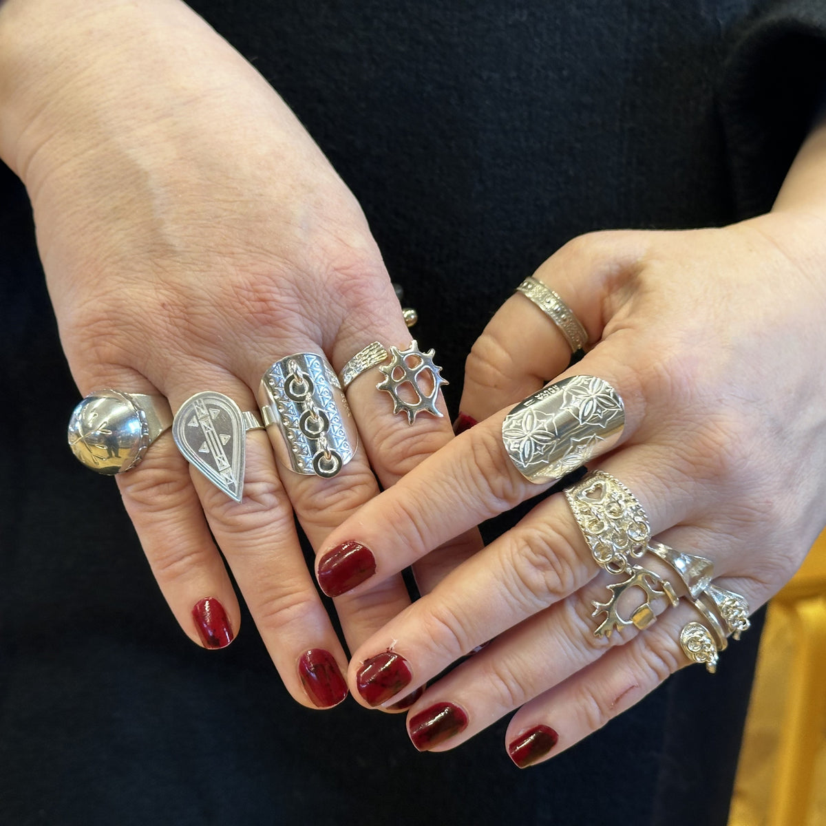 Varje smycke bär på en berättelse – formgiven med känsla för naturens linjer, fjällens stillhet och uråldriga symboler. Ett möte mellan kulturarv och modern nordisk design, skapat för att bäras med stolthet och närhet.